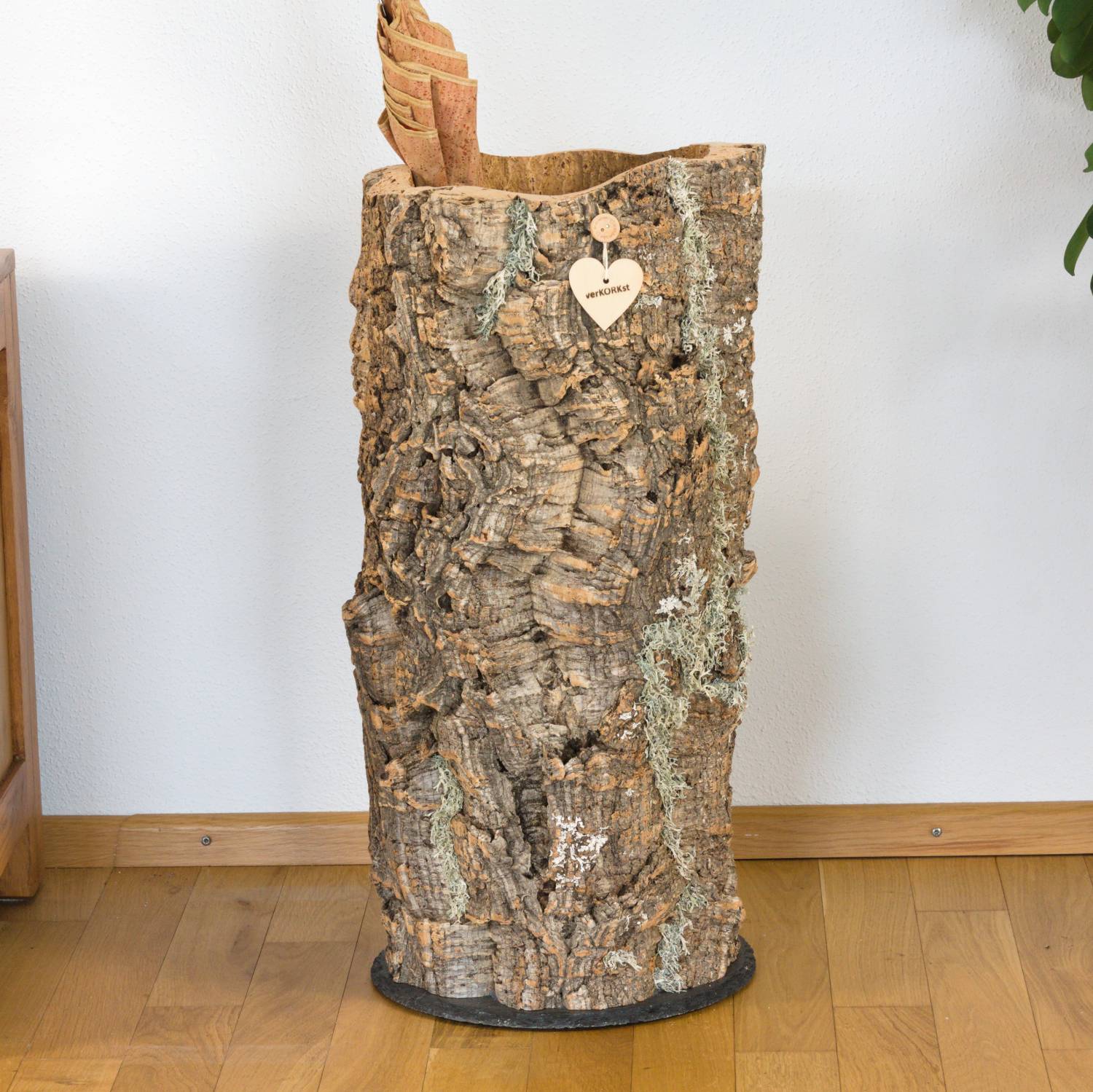Korkrinden ermöglichen mit einer Portion Kreativität und entsprechendem handwerklichen Geschick fast unerschöpfliche Gestaltungsmöglichkeiten. Ein wunderbares Beispiel hierfür sind unsere Regenschirm-Ständer, gefertigt aus einem Stück Rinde der ersten oder ab der zweiten Schälung, verschraubt mit einer Schieferplatte mit Filzgleiter zum Schutz Ihres Bodens.
